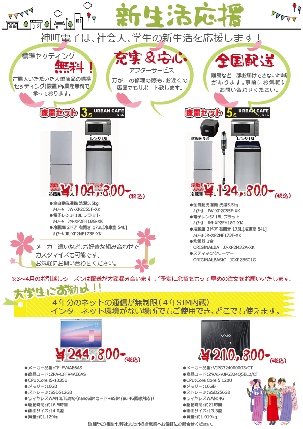 新生活応援家電セットや、大学生向けのPCなど掲載しております。
